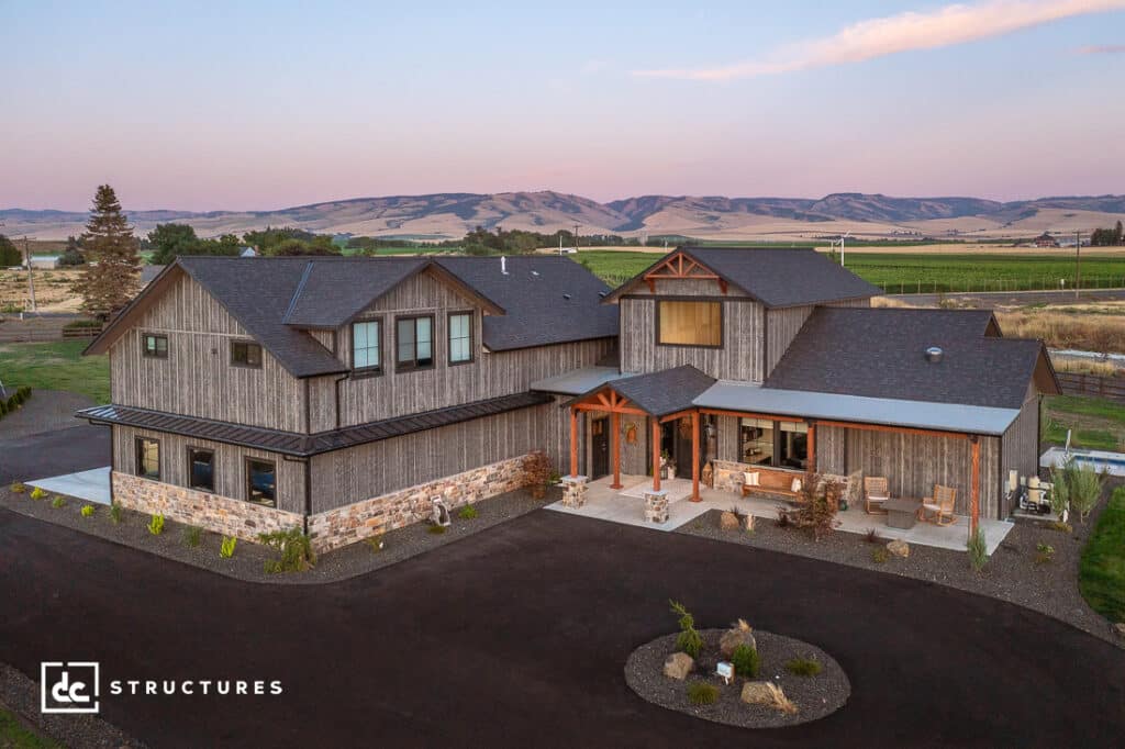 This newly-constructed home in Walla Walla, Washington, is modern farmhouse living at its finest! In some ways, this custom residence mimics aspects of our Thielsen Timber Frame Home Kit, including its L-shaped design and covered back porch area. However, in many other ways, it manages to stand out as an entirely original farmhouse-style home with contemporary flair.