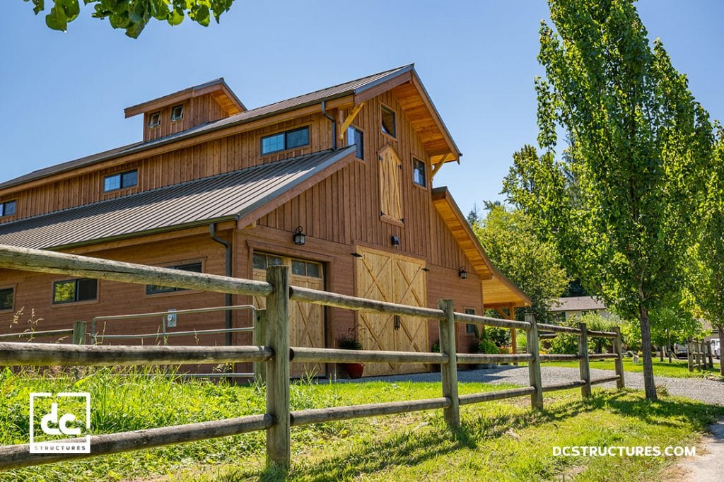 Our client opted to replace our standard Douglas fir tongue and groove siding with cedar tongue and groove siding and our standard breezeway doors with steel-framed man doors. Our designers also added a 40″ x 96″ custom cupola and two dozen additional windows to this commercial design. Our client elected to add a pre-staining package that included the staining of all cedar siding and trim on all four sides before delivery. They supplied the rest of the exterior doors to finish this unique custom barn kit project.
