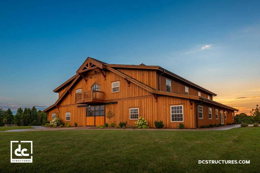 Sitting on a historic 132-acre farm in Greenville, Tennessee, The Homeplace at Johnston Farm is a rustic wedding venue built from a tastefully modified Sunnyside wedding and event barn kit from DC Structures. With an expanded 84′ x 72′ footprint, this gorgeous barn can accommodate almost any celebration. A primary feature of this venue is a wraparound loft, which was created by raising the sidewall height, adjusting the roof pitch, and adding large shed dormers to both sides of the structure. We also eliminated posts and incorporated massive 24″ beams to create a wide-open 36′ x 48′ main hall. Additionally, this all-inclusive facility features a bridal suite, a groom’s suite, an office, a full kitchen, and ADA restrooms.